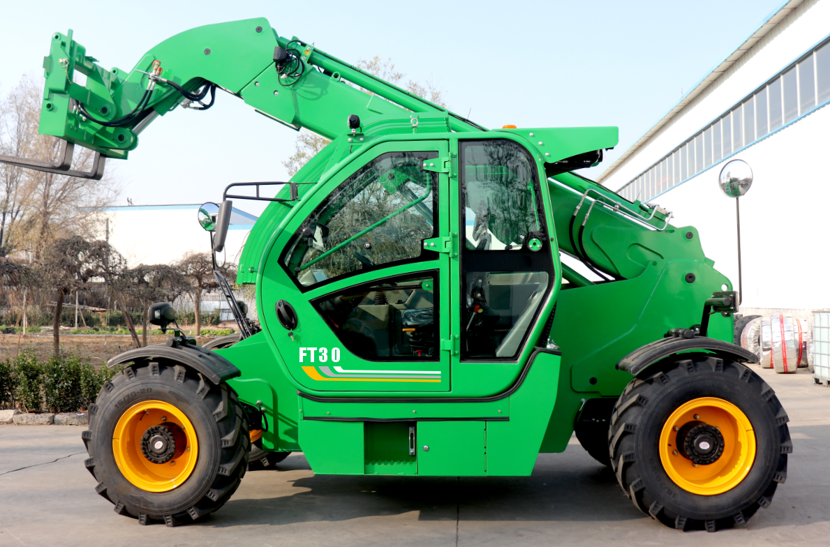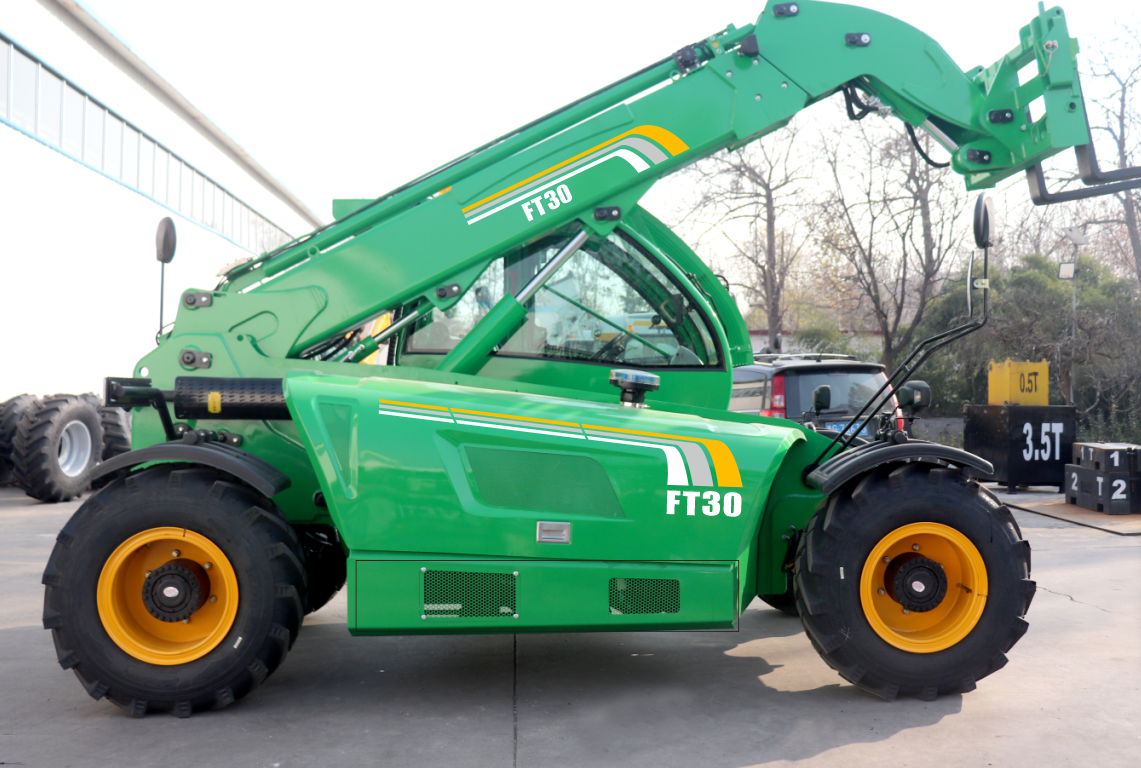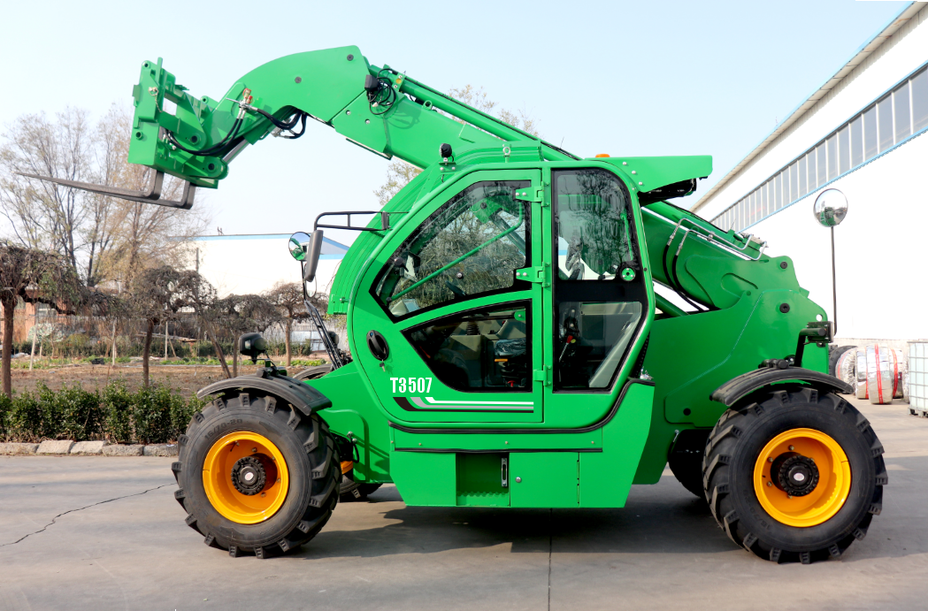 Three-section telescopic arm, Yuchai 77.3KW National II engine, luxury cab with LED lights/window breaker/fire extinguisher/rear sliding window/10-inch driving + reversing image/rear + right front camera, electronic travel, automatic leveling of forks, load-sensitive multi-valve electric proportional control system, 16/70-20 tires, steam brake axle single axle load of 10 tons, special forklift integral high and low speed gearbox (4F/4R), four-wheel drive, front-wheel steering + four-wheel steering + crab walking three steering modes, plate-fin radiator, front and rear adjustable large shell instrument steering wheel, color LCD display, multimedia, torque limiting system, adjustable luxury seat, hydraulic quick change, heating and cooling air conditioning, rubber six hose (with sheath), frame 355 manganese plate, telescopic arm material BS1000 high-strength manganese plate, load capacity 3.5 tons, 1220mm sliding tow fork, lifting 10.5 meters, with outriggers, cast iron counterweight.